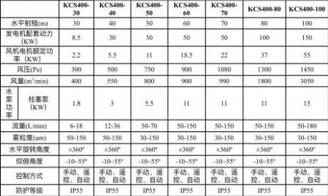 采用鄭州鄭通霧炮,型號為KCS400-100,水平射程100米,發(fā)電機配套動力150千瓦,風(fēng)機電機額定功率55千瓦,風(fēng)壓1450pa,風(fēng)量3050立方每分鐘,水泵為柱塞泵,水泵功率15千瓦,流量50-180L每分鐘,霧粒度30-150urn,水平旋轉(zhuǎn)角度±360度,仰俯角度-10到55度,控制方式:手動、遙控、自動,防護等級IP55。